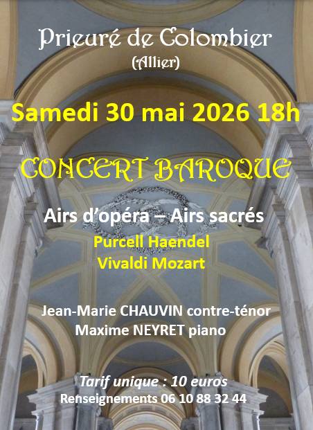 Le prieuré de Colombier dans l’Allier (03600) renoue cette année 2026 avec ses animations musicales, occasion rare de pouvoir découvrir ce monument historique de l’intérieur. La grande salle du prieuré datant du XVe siècle va vibrer aux sons d’airs d’opéra et d’airs sacrés de Purcell, Haendel, Vivaldi et Mozart. Ces airs seront interprétés par Jean-Marie Chauvin contre-ténor accompagné au piano par Maxime Neyret. Les deux musiciens se sont produits notamment à la chapelle de l’Ancienne Visitation de Moulins et à la chapelle du Sacré Cœur de Montluçon en 2025. Tarif unique : 10 €. Renseignements au 06.10.88.32.44.