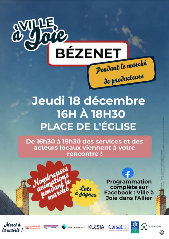 Bonjour Bézenet ! Ville à Joie vient à votre rencontre ce Jeudi 18 décembre, pendant le marché de producteurs sur la Place de l'Eglise. Préparez-vous à une après-midi de découverte et de convivialité au cœur de votre village !